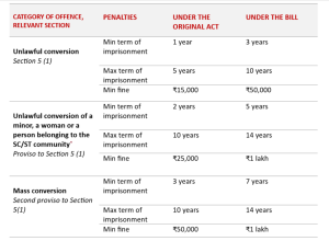 * Note: The Bill adds the category of ‘disabled or mentally handicapped person’ to the list of persons whose conversion would constitute an aggravated offence—existing categories include minor, woman or person belonging to a Scheduled Caste or Scheduled Tribe.