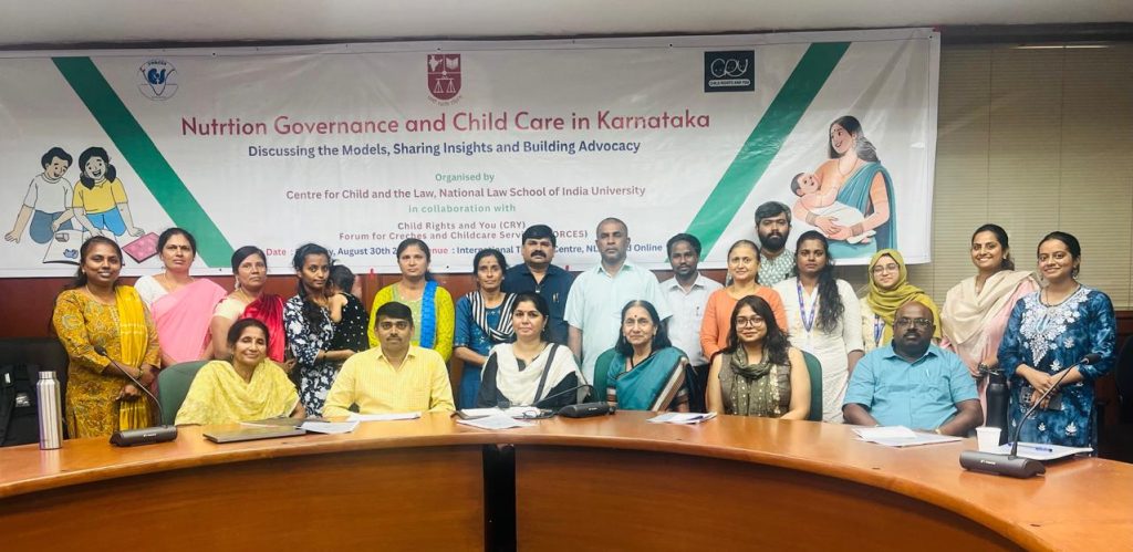 The Centre for Child and the Law (CCL), National Law School of India University, Bengaluru, in collaboration with Child Rights and You (CRY) and Forum for Crèches and Childcare Services (FORCES), organised a state-level consultation on Nutrition Governance and Child Care in Karnataka on August 30, 2025 at the NLSIU Training Centre. The hybrid consultation brought together civil society organisations, community women leaders, researchers, domain experts and practitioners to share insights and strategies for advancing early childcare, child rights and nutrition governance under the National Food Security Act (NFSA), 2013.