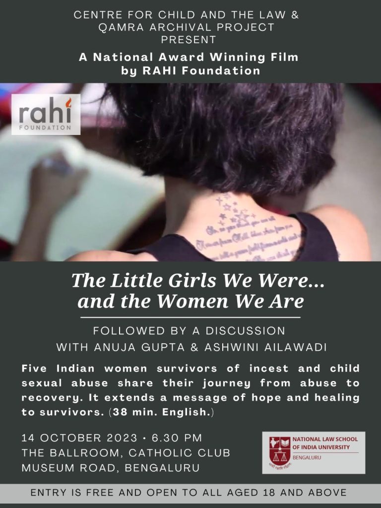 The Centre for Child and the Law along with the QAMRA Archival Project at NLSIU is screening a National Award Winning Film by RAHI Foundation titled “The Little Girls We Were…and the Women We Are” on Saturday, October 14, 2023. The event is being hosted at The Ballroom, Catholic Club Museum Road at 6.30 pm.