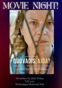 Following up on the success of ‘Kumbalangi Nights’ movie screening, we will be screening the Oscar nominated and critically acclaimed Bosnian film Quo Vadis, Aida? (Where are you going, Aida?) this week. The screening will take place on December 16, 2022 at the Krishnappa Memorial Hall, OAB from 7 PM onwards.