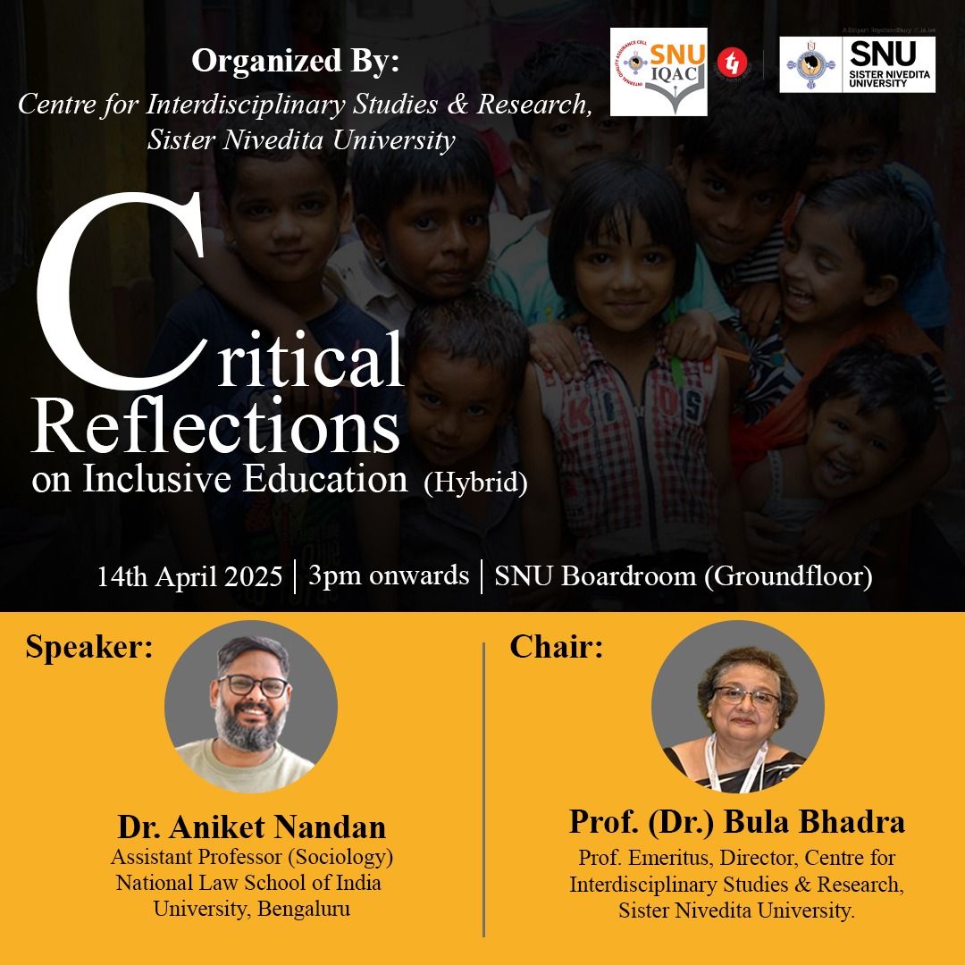 NLSIU Faculty Dr. Aniket Nandan, Assistant Professor, Sociology, will be delivering a special lecture on ‘Critical Reflections on Inclusive Education’ at Sister Nivedita University, Kolkata. The lecture is being organised by the Centre for Interdisciplinary Studies & Research at SNU, and will take place 3 pm onwards, on Monday, April 14, 2025.